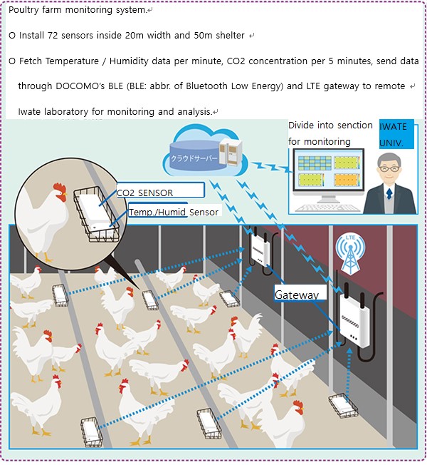 Iwate university agriculture department has been doing IoT technology based test with NTT DOCOMO, to find mutual relation between chickens’ sudden death and environmental variables inside MINAMI FOOD owned poultry farms located Iwate prefecture.Tha